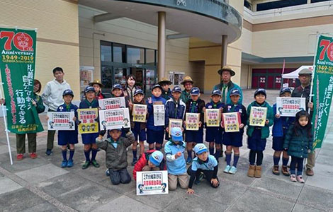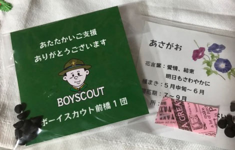 毎年恒例で募金活動をなされ、今回は日連の台風19号の義援金募金活動で、募金箱、チラシ、夏育てた朝顔の種の袋詰めと全てスカウト達が力合わせて作成されました。寒さも吹き飛ばすくらいの大きな声でお礼をいって、ポスターなども今回は自分達が作ったので気合が入っていたそうです。たった1時間強でしたが募金金額も約6万円になり、ご協力してくださった人たちに感謝してスカウト達は笑顔溢れる姿を見せてくれたそうです。